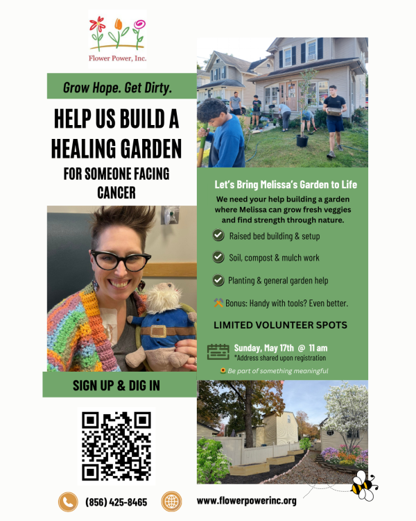 Join Flower Power, Inc. to help build a healing vegetable garden for Melissa as she recovers from cancer treatment. Volunteers will assist with raised beds, planting, mulch, and garden setup so she can grow fresh food, restore wellness, and experience the healing power of nature.